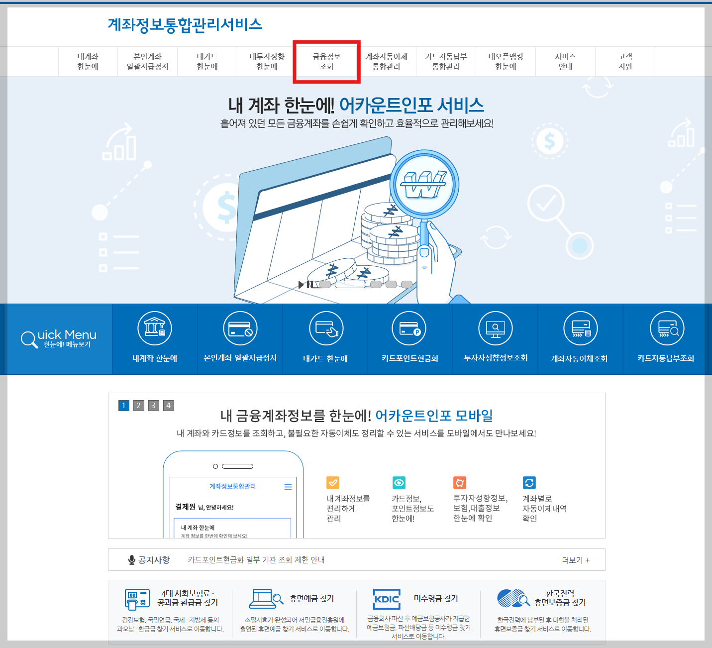 홈페이지에 접속했다면 상단바에 '금융정보 조회'를 클릭합니다.
