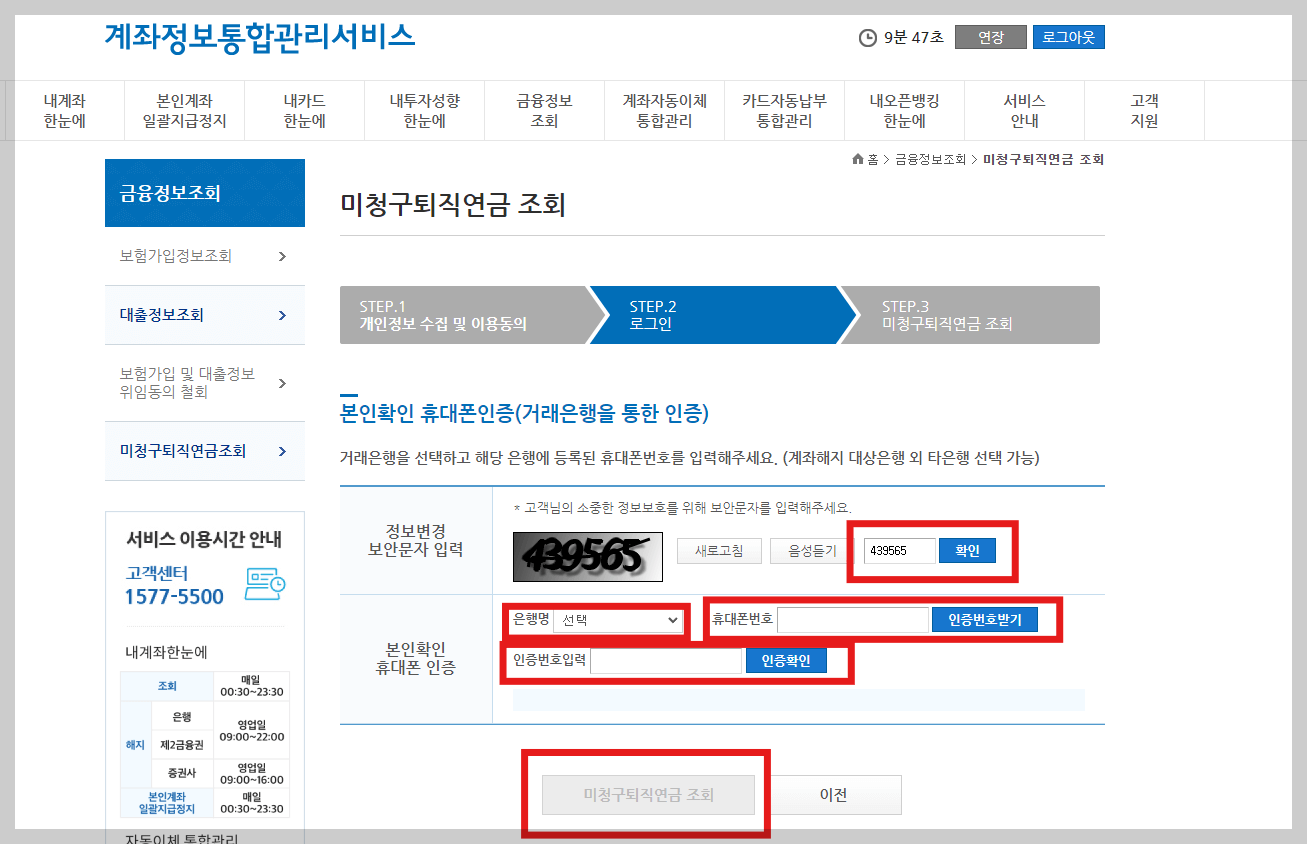 보안문자와 본인확인 정보를 입력합니다. 인증 완료 후 미청구퇴직연금 조회를 클릭합니다.