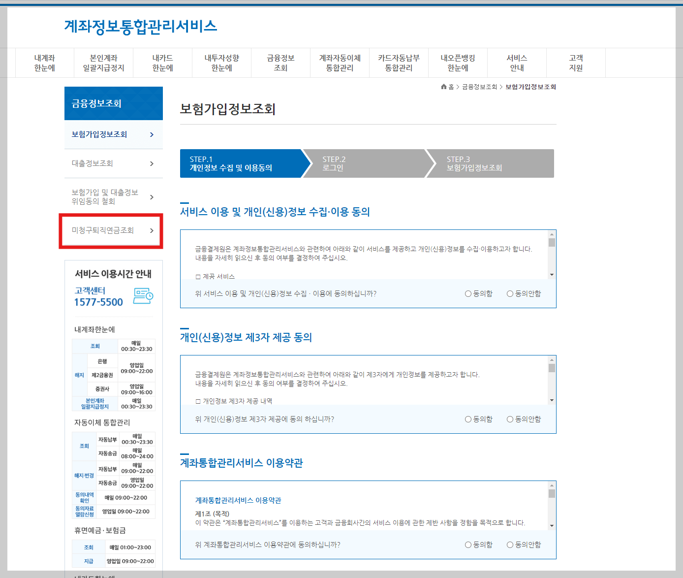 왼쪽 상단 바에서 '미청구퇴직연금조회'를 클릭합니다.